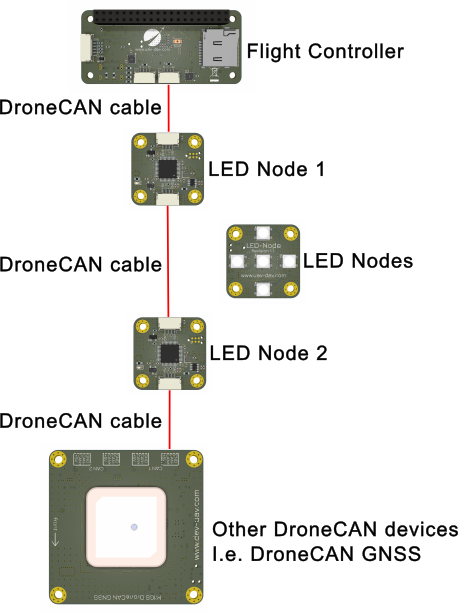 Die LED-Module werden über den DroneCAN-Anschluss mit dem Flight Controller verbunden. Ist der Anschluss bereits in Nutzung, können die LED-Module problemlos in den vorhandenen DroneCAN-Bus eingebunden werden. Es können mehrere LED-Module an einem Bus betrieben werden; dabei ist jedoch auf den maximal zulässigen Versorgungsstrom des DroneCAN-Anschlusses zu achten.