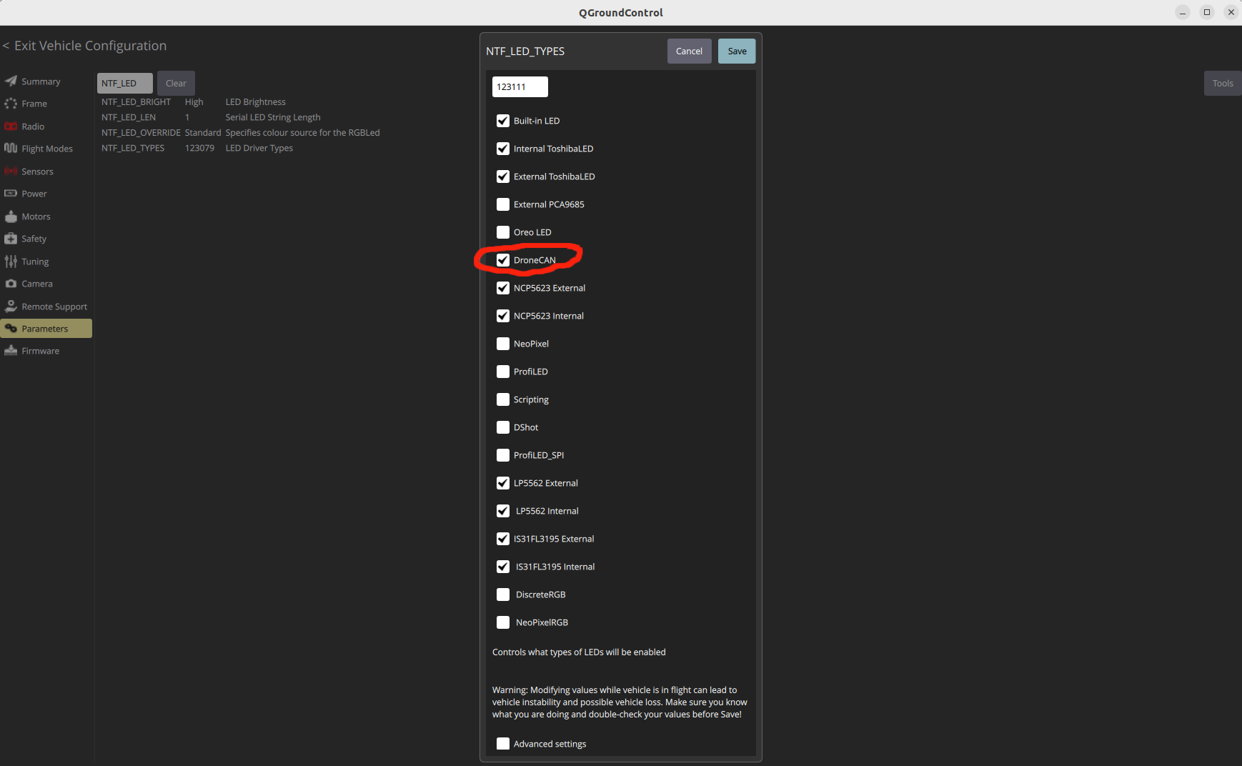 Im NTF_LED_TYPES Parameter im AurduPilot muss DroneCAN aktiviert werden. Dazu muss das Bit 5 (Dezimal 32) gesetzt werden.
